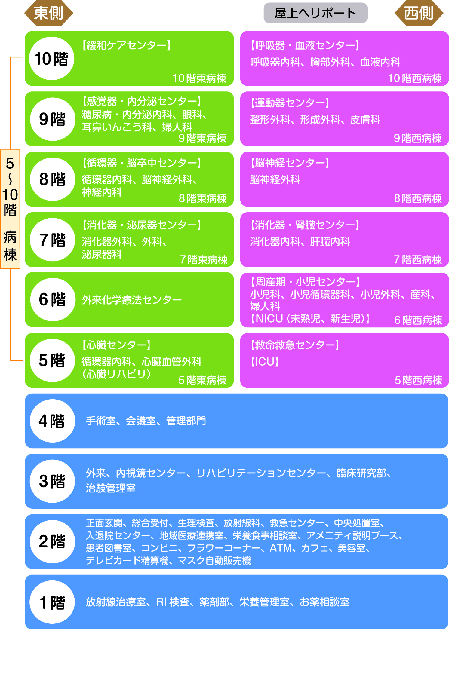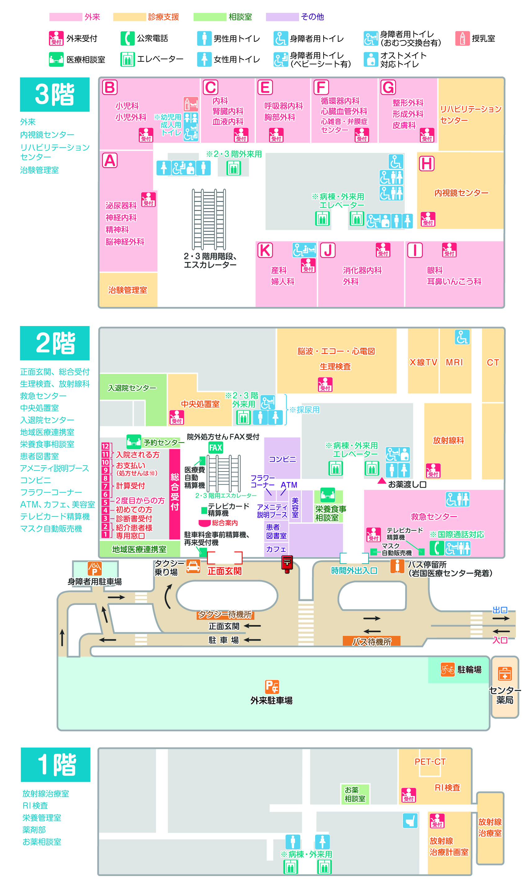 入院中の方のための駐車場は設置していませんので、ご了承ください。尚、入院患者さんのご家族の方で、付添等のやむを得ない場合における駐車料金の取り扱いについては、入院されている病棟の看護師へお問い合わせください。
