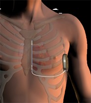 従来の植込み型除細動器と異なり、リード線は前胸部の皮下に、本体は側胸部の皮下に植え込まれます。そのため、手術時の合併症の軽減や遠隔期における感染のリスクを大幅に低減させる可能性があります。