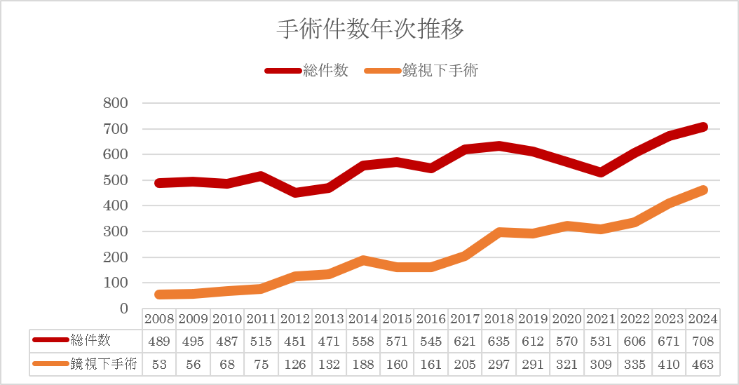 外科の手術件数の年次推移では2024年は初めて700件を越え、712件となっております。ただ、本年は麻酔科医の減少があり、それに伴って件数も減少傾向です。腹腔鏡下手術は463件と過去最高となり、総数に対する腹腔鏡下手術の割合も65.4%と昨年の61.1%を越えております。近年は腹腔鏡に加えてロボット手術が取り入られており、双方を併せて低侵襲手術と呼ばれる事から正確には低侵襲手術の割合となります。当院もロボット手術支援システムのda VinciがSiからXiに更新され、日々ロボットによる手術を行っております。