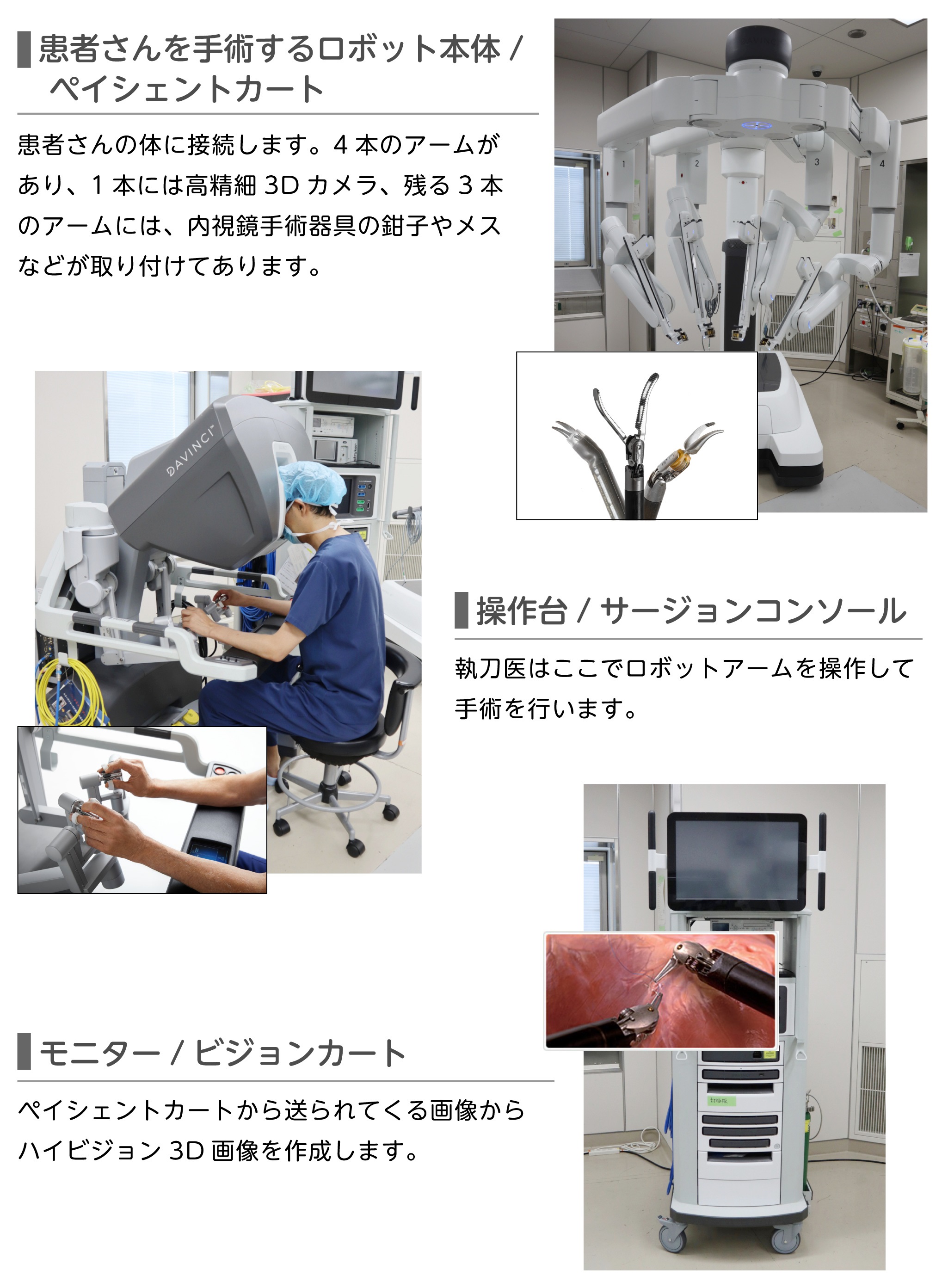 手術支援ロボット「ダヴィンチ サージカルシステム(以下「ダヴィンチ」)」とは、優れた機能で術者をサポートし、手術の安全性向上と低侵襲を実現可能とした 医療ロボットのことです。鏡視下手術(腹腔鏡下手術・胸腔鏡下手術など)は、患者さんの負担が少ない低侵襲の術式として広く普及しています。
